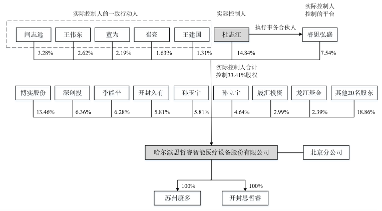 不過,隨著外部投資者涌入,思哲睿股權(quán)較為分散。IPO前,思哲睿無控股股東,實(shí)際控制人為杜志江。杜志江通過直接持有14.84%股份、一致行動(dòng)人持有11.03%股份、作為合伙人參股公司睿思弘盛持有7.54%股份,合計(jì)控制思哲睿33.41%股份。
