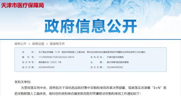 4月28日,天津市醫(yī)保局發(fā)布《關(guān)于落實(shí)京津冀“3+N”醫(yī)藥采購聯(lián)盟人工晶體類、骨科創(chuàng)傷類和吻合器類醫(yī)用耗材帶量聯(lián)動采購和使用工作的通知》,通知對采購品種和約定采購量進(jìn)行規(guī)定,帶量采購結(jié)果將在一年周期內(nèi)執(zhí)行,醫(yī)療機(jī)構(gòu)需優(yōu)先使用中選產(chǎn)品。