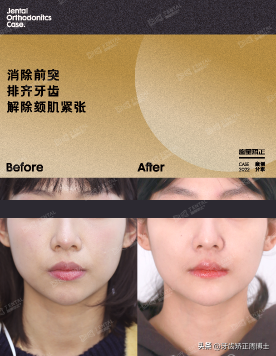 從后的對比圖可以看到她的面下三分之一的變化很大,口周肌肉得到放松之后,視覺看上去嘴唇變小了。突嘴內(nèi)收進(jìn)去后,原先偏銳的鼻唇角變?yōu)閹缀踔苯?,頦部也從后縮的狀態(tài)變化到擁有的頦唇溝,面型得到的改良。
