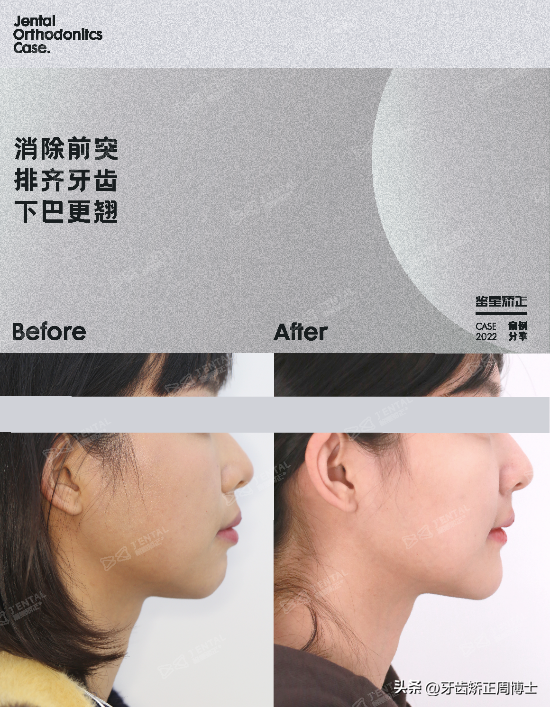 正確的思路實際上是矯正牙齒,這樣骨性前突和下頜后縮可以一同得到改良。這也是我們典型的案例之一,想要解決前突后縮,就需要讓下巴逆旋,這樣前突解決的同時下巴也“旋”出來了,從側(cè)面看就是漂亮的直面型。