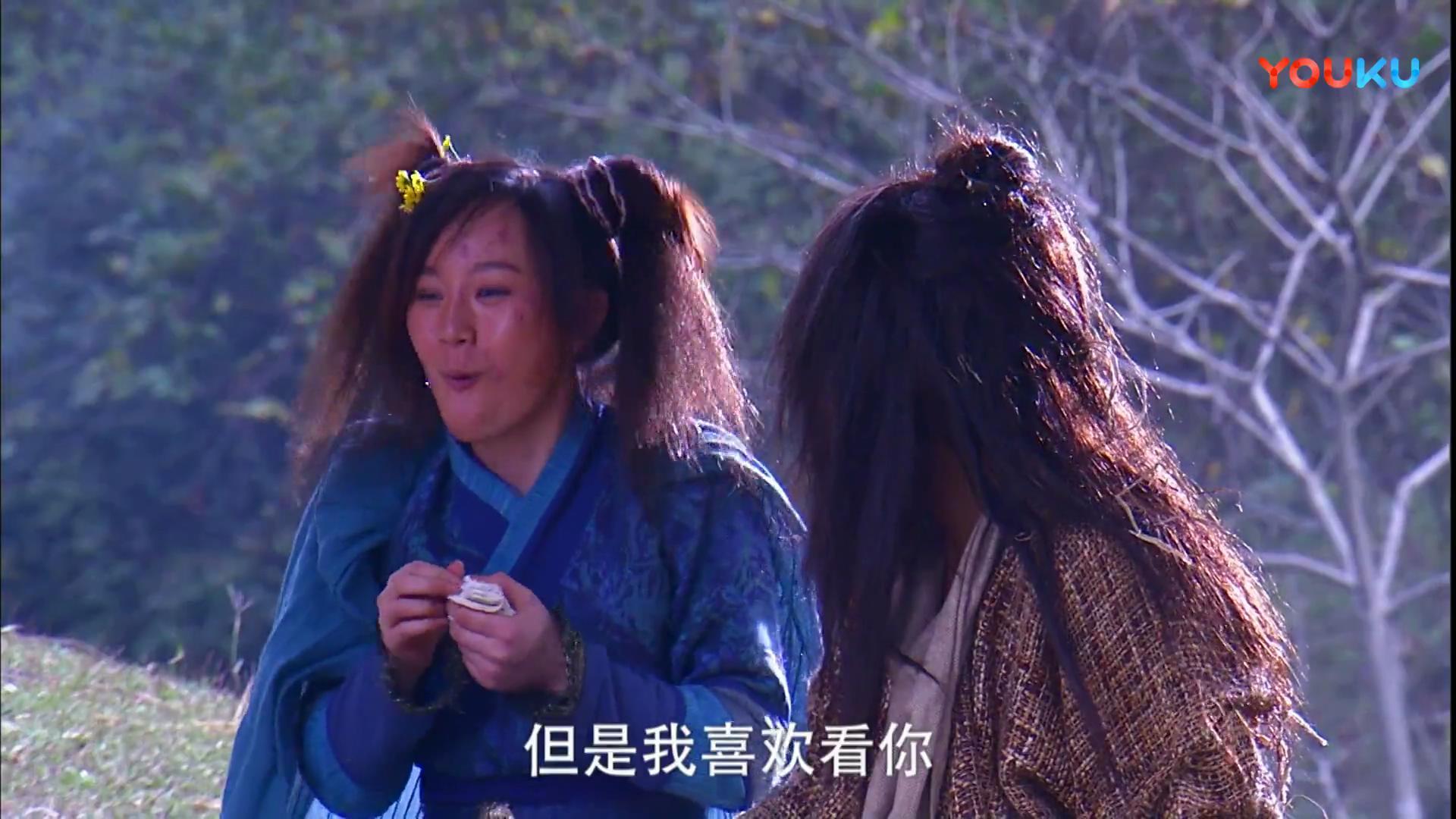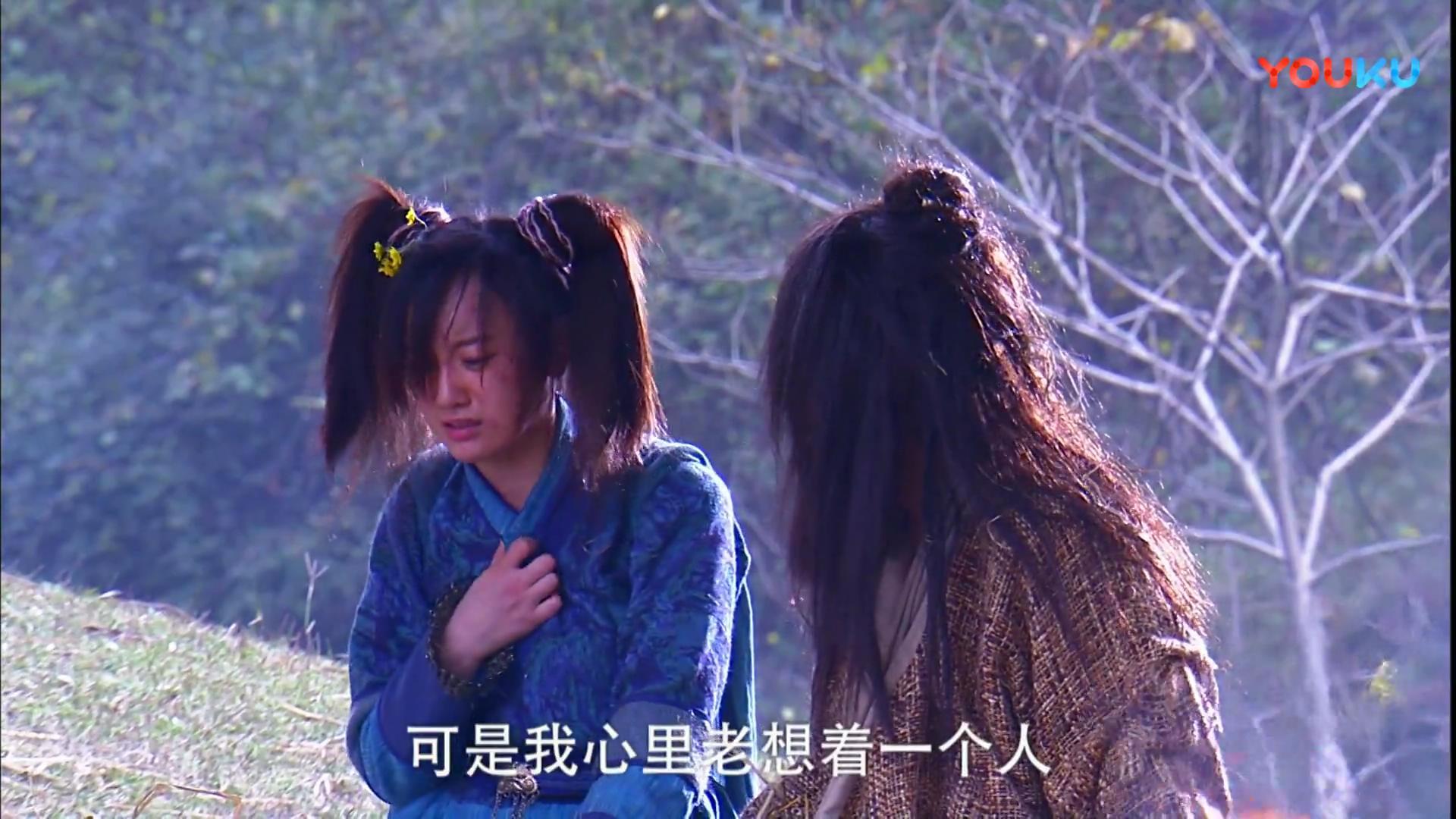 這版將原著中殷離和張無忌的交心改編成了下面一段戲,雖然是編劇自己加的,果卻還不錯。殷離背無忌出去散心,告訴了無忌自己的心事,聽她一連串講下來,無忌知道了殷離心心念念的情郎竟是自己(在原著中無忌是過了很久才知道的)。