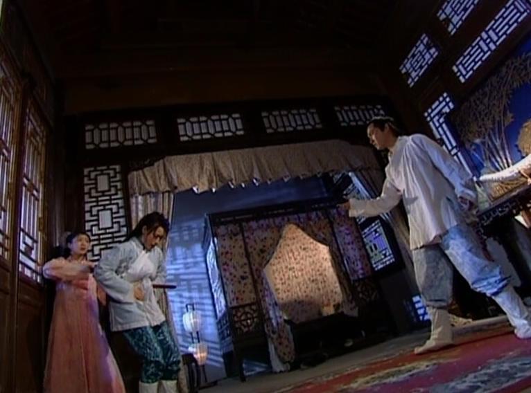 殷離忽然現(xiàn)身,殺死了朱九真。衛(wèi)壁驚得大叫,引來在府上居住的峨眉派,峨眉弟子合力擒住了殷離。這段在原著中算是隱藏劇情,19版正面拍了出來,不過人員配置上有了些變化。