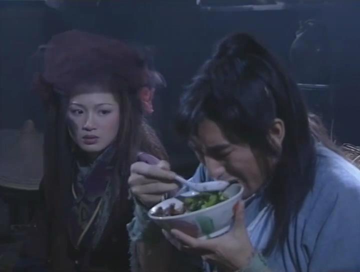 到了晚間,殷離給無忌送了飯菜來。因殷離喂他,無忌又想到了周芷若,嗯,這版張無忌是個情種沒錯了。殷離講了自己愛慕的人令自己傷心的事,如原著,張無忌罵那人來替她出氣,殷離卻不許他侮辱自己的心上人。