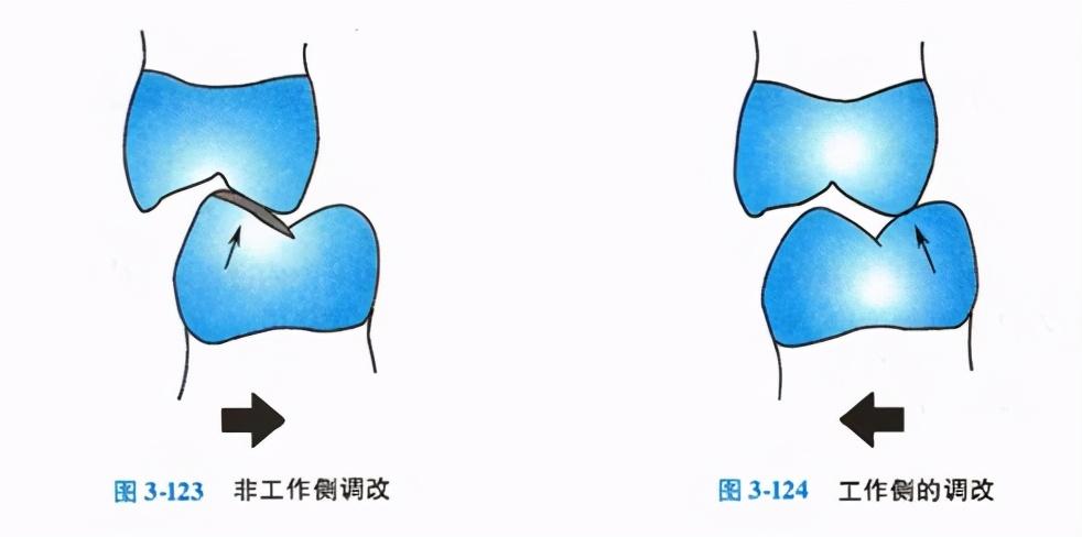 用咬合紙檢查早接觸的位置。在調(diào)節(jié)非工作側(cè)早接觸時,出現(xiàn)在上頜舌尖頰斜面的早接觸點,或出現(xiàn)在下頜頰尖舌斜面的早接觸點應被消除(圖3-123)。