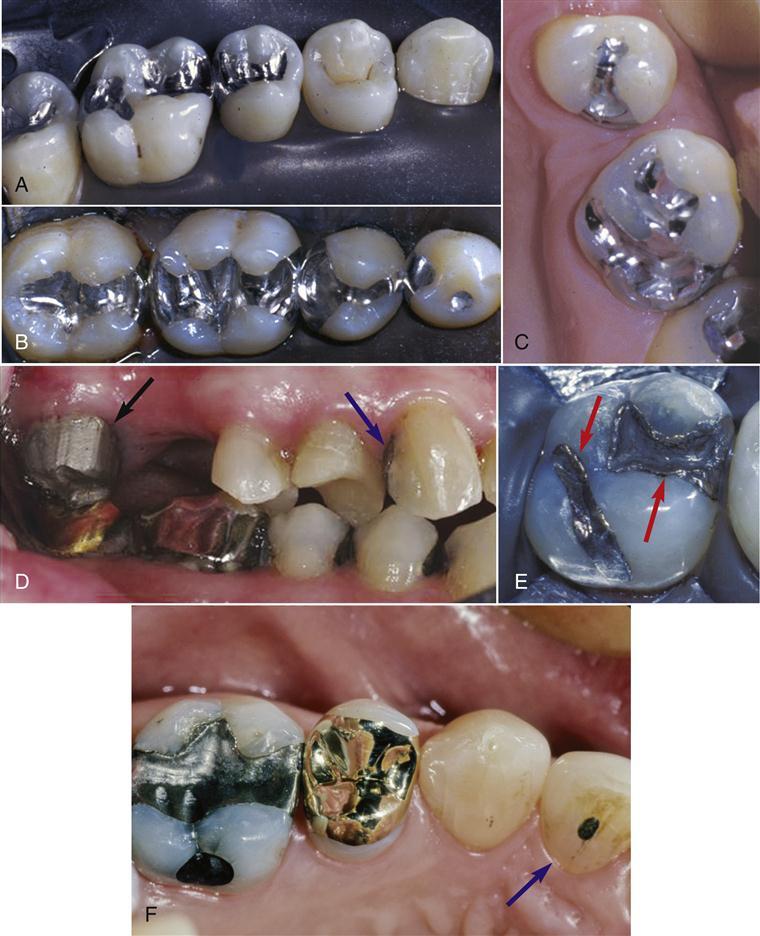 (3)邊緣適合性(marginaladaptation):修復體的鄰接檢查合適后,在修復體徹底就位的情況下仔細觀察冠邊緣的情況。合適的冠邊緣不應存在過長(over-extended)、過短(under-ex—tended)、過厚以及與頸緣之間有間隙的情況(圖3—119)。冠邊緣與頸緣之間的間隙大于50p~m的狀態(tài)通常被認為是間隙過大,這樣大的間隙意味著探針的尖可以探入冠邊緣與頸緣之間。位于齦下的冠邊緣的適合度很難檢查,而齦下不適合的冠邊緣對牙齦的健康為有害。
