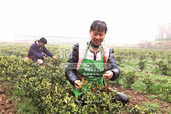 本網(wǎng)訊 3月13日上午,記者在安溪鎮(zhèn)譚洪村的一片茶地里看到,在不到膝蓋高的茶樹尖上,長出了金黃色的嫩芽,村民們正在采摘這些嫩芽?!斑@是試種的新品種茶,由于茶葉品質(zhì)好,價(jià)值高,加之呈金黃色,所以名字叫‘黃金茶’。”譚洪茶葉專業(yè)合作社社長王發(fā)明興奮地說,從今年試產(chǎn)的情況看,安溪引種黃金茶已經(jīng)獲得成功,填補(bǔ)了銅梁本地?zé)o高端茶的空白。