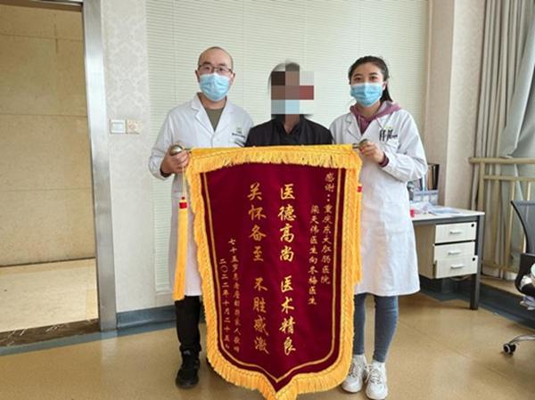 近日,75歲詹婆婆將一面寫有“醫(yī)德高尚醫(yī)術(shù)精良,關(guān)懷備至不勝感激”的錦旗,送到重慶東大肛腸醫(yī)院醫(yī)生梁天偉和醫(yī)助向冬梅手中,以此表達(dá)對全體醫(yī)護(hù)人員的衷心感謝。