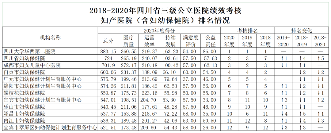 在婦產(chǎn)醫(yī)院的考核中,本次參評(píng)的婦產(chǎn)醫(yī)院(含婦幼保健院)共計(jì)12家,前三分別為四川大學(xué)華西第二醫(yī)院、四川省婦幼保健院、成都市婦女兒童中心醫(yī)院。