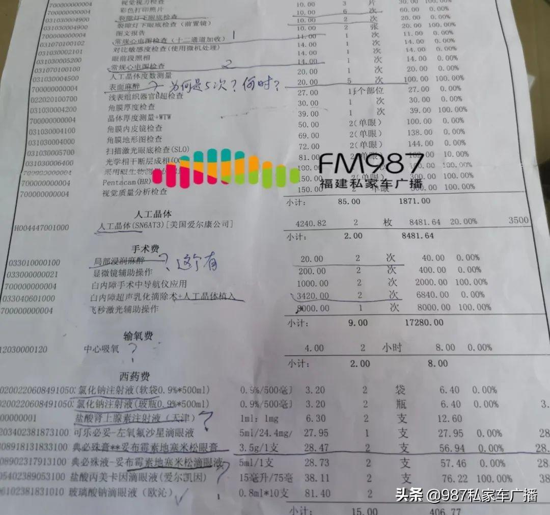 記者看到,王女士有疑問(wèn)的收費(fèi)項(xiàng)目有:中心吸氧兩小時(shí)8元、局部浸潤(rùn)麻醉2次40元、表面麻醉5次100元、心電監(jiān)測(cè)術(shù)中兩次10元、小換藥3次5元、中換藥1次11元,靜脈輸液2次6元、沖洗結(jié)膜囊10次60元等等。王女士在這幾頁(yè)清單中用藍(lán)筆打了問(wèn)號(hào)、標(biāo)注了”重復(fù)“、”子虛烏有“等字。