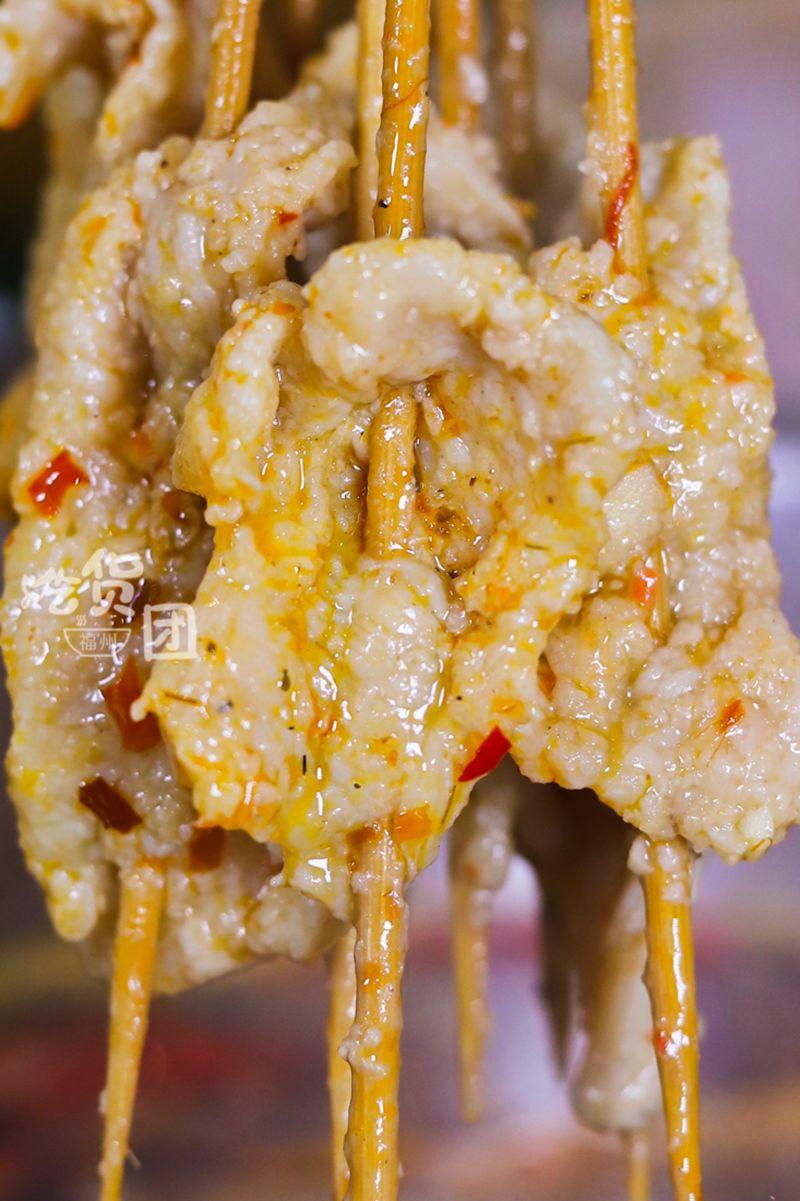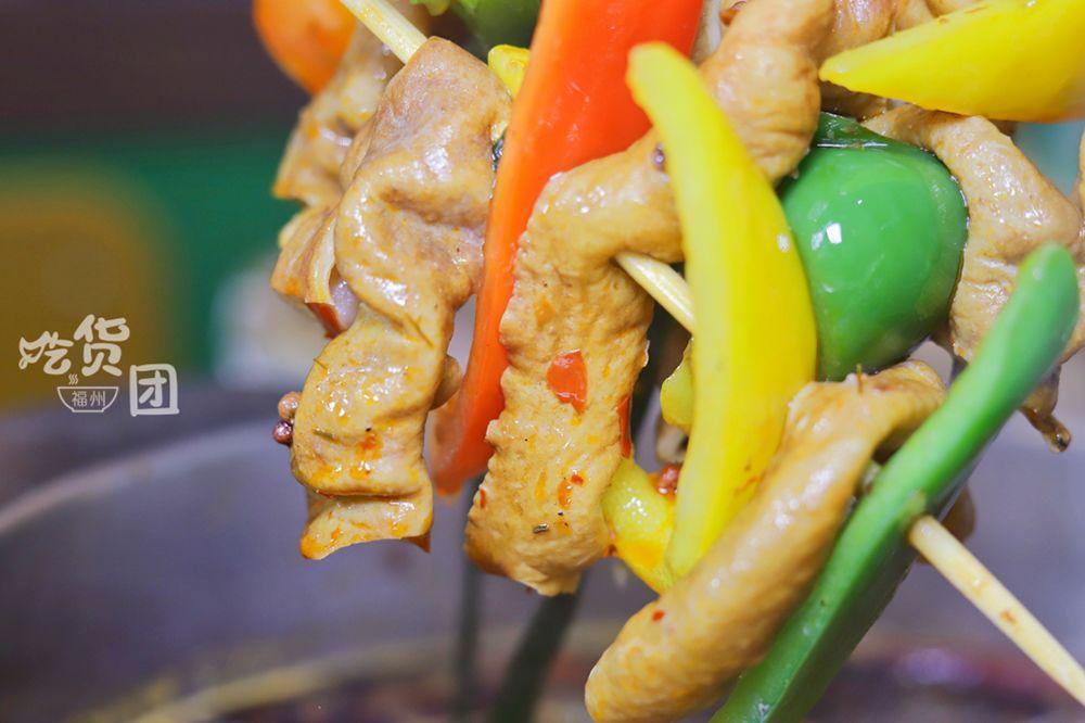 班花串串香特制的滑肉,用的是緊實的豬頸肉,外層裹上一層薄薄的地瓜粉,剛入嘴有點像?;粯踊?,但吃著又特別有嚼勁。