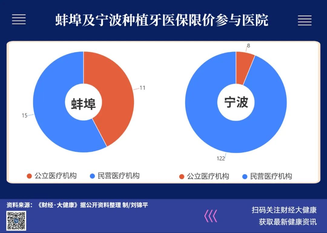 《財經(jīng)·大健康》梳理發(fā)現(xiàn),此次參與蚌埠種植牙限價的醫(yī)院中,公立醫(yī)院11家,民營機構(gòu)為15家;寧波則為公立醫(yī)院8家,民營機構(gòu)為122家。