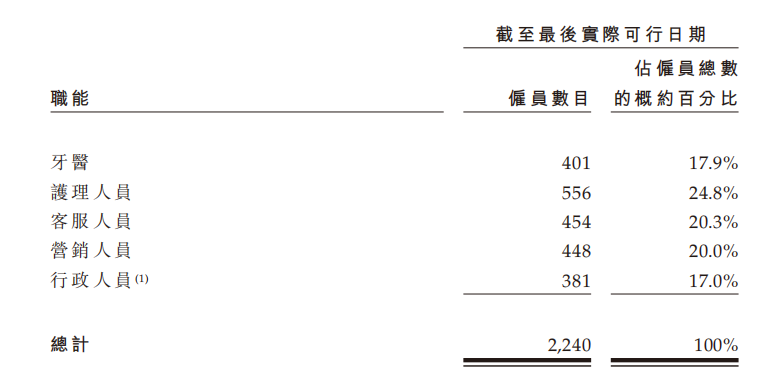 從其員工構(gòu)成來看,或許銷售真的是牙博士的生產(chǎn)力。根據(jù)招股書,截至后報告期內(nèi),公司的牙醫(yī)只有401名,少于客服人員的454名和營銷人員448名。
