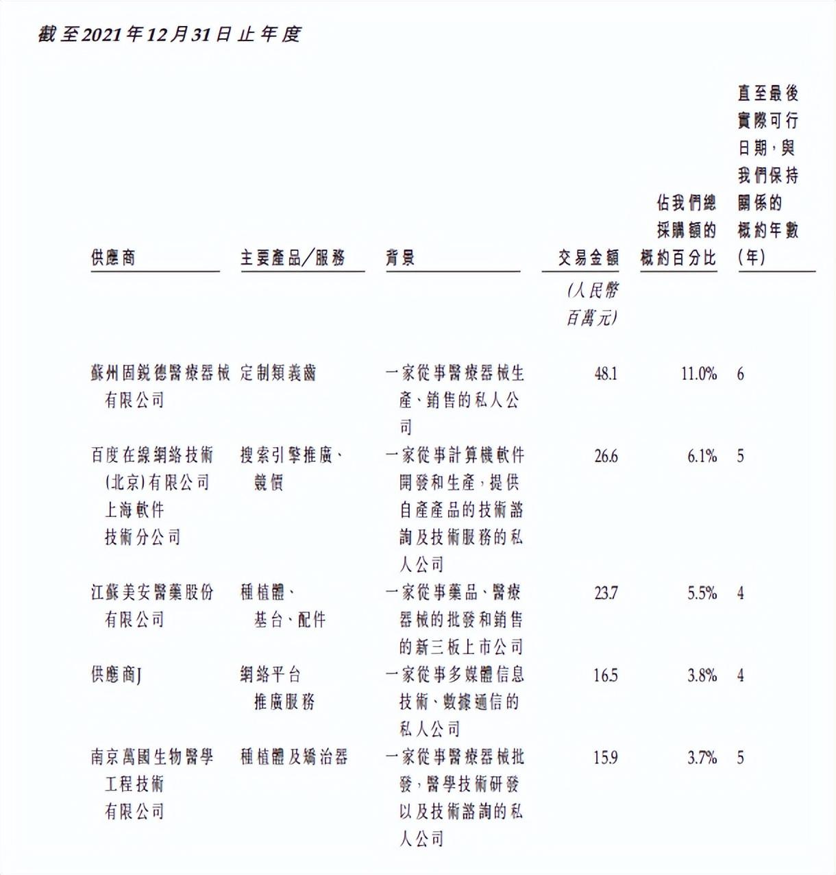 從其招股書中所羅列的五大供應(yīng)商來看,作為一家重點業(yè)務(wù)在種植牙與矯正牙齒的口腔服務(wù)行業(yè),百度近三年卻一直是集團的前三供應(yīng)商,2021年的競價費用持續(xù)上漲,花了2660萬元,使得百度成為其年度第二大供應(yīng)商。并且,2021年前五大供應(yīng)商中還出現(xiàn)了另一家未披露的廣告供應(yīng)商。