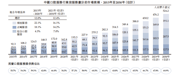 根據(jù)灼識咨詢報告,中國口腔服務(wù)行業(yè)的市場規(guī)模持續(xù)擴大,由2015年約923億元增加至2020年的1628億元,年復(fù)合增長率為12%,并且預(yù)計到2030年將達約5262億元,年復(fù)合增長率達12.4%。