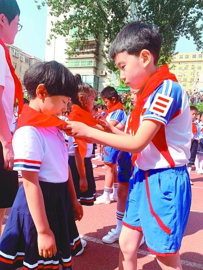 “六一”兒童節(jié)到來之際,山東煙臺芝罘區(qū)南通路小學舉行少先隊員入隊儀式。柳洪濤攝/光明圖片