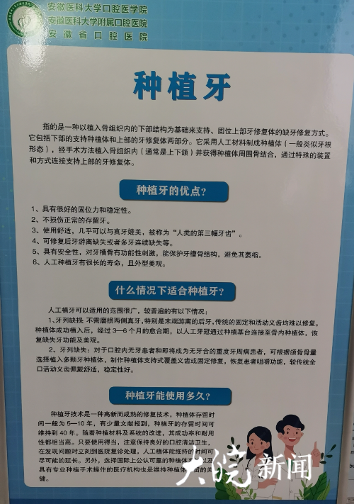 在走訪中,記者了解到,安徽醫(yī)科大學(xué)附屬口腔醫(yī)院種植牙費用從 6500 到 18000 元不等。因為種植體系不同,調(diào)節(jié)方案不同,價格也不同。