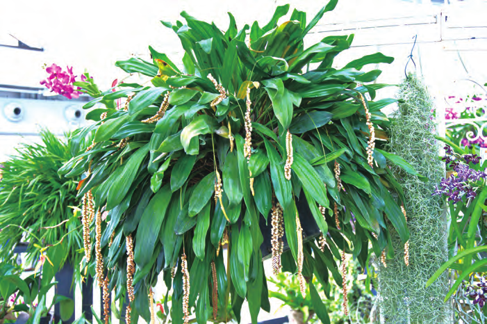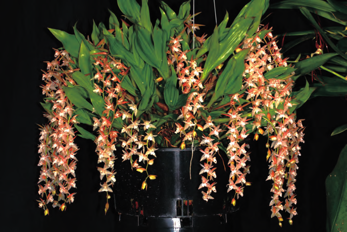 肥料 石仙桃比較喜肥,但忌施高濃度肥料。一般每個(gè)主分枝每年僅長(zhǎng)出1 個(gè)新假鱗莖,因此在旺盛生長(zhǎng)期間,建議施用水溶性肥料和緩釋肥料兩種,以其培養(yǎng)出肥大的球莖。石仙桃對(duì) N、P、K 的需求不同,一般馴化苗栽種 1 周后,用花寶 1 號(hào) 4000 ~ 5000倍液噴淋透基質(zhì) 1 次,隔 3 天再淋施 1次。1 ~ 3 周后,根據(jù)小苗干濕情況隔5 天稀釋 3000 ~ 4000 倍液進(jìn)行噴淋施1 次。當(dāng)幼苗開始長(zhǎng)葉后,小苗階段用N、P、K 比例為 2 ∶ 1 ∶ 1 的水溶性復(fù)合肥料,如花寶 5 號(hào)、花多多 10 號(hào),濃度為 3000 ~ 4000 倍液,每 10 ~ 15天施用 1 次,并每 5 ~ 6 個(gè)月施用奧綠肥 5 號(hào)長(zhǎng)緩釋肥 1 次,以及每月 1 次噴施 3000 倍液的花多多 36 號(hào) TE 微量肥。中苗階段,則應(yīng)以 N、P、K 的比例 為 2 ∶ 1 ∶ 1 和 1 ∶ 1 ∶ 1 兩 種 肥料 2000 ~ 3000 倍液交替施肥,每隔7 ~ 10 天施用 1 次,如花寶 5 號(hào)、花寶2 號(hào)、花多多 10 號(hào)、花多多 1 號(hào),并每 3 ~ 4 個(gè)月施用奧綠肥 301 號(hào)長(zhǎng)控釋肥 1 次,以及每月噴施 3000 倍液的花多多 36 號(hào) TE 微量肥 1 次。大苗階段,以 N、P、K 比例為 1 ∶ 1 ∶ 1 和1 ∶ 2 ∶ 2 的兩種肥料以 1000 ~ 2000倍液交替施用,每隔 7 ~ 15 天施 1 次,如 花 寶 2 號(hào)、 花 多 多 1 號(hào) 和 11 號(hào),并每隔 3 ~ 4 個(gè)月施用奧綠肥 601 號(hào)(10-11-18+2MgO+TE)1 次, 每 月 繼續(xù)噴施 1 次 3000 倍液的花多多 36 號(hào)TE 微量肥。在進(jìn)入花芽生長(zhǎng)期,應(yīng)改施用以 N、P、K 比例為 1 ∶ 3 ∶ 2 為主的肥料,如花寶 3 號(hào)或花多多 2 號(hào)1000 ~ 2000 倍液的濃度每周淋施 1 次,直至抽出花梗時(shí)停止施肥?;ê笠鶕?jù)季節(jié)施肥,建議在夏末和秋季使用低氮高磷的肥料,以促進(jìn)下一季更好地開花,并使新長(zhǎng)出的假鱗莖在冬季前變硬成熟。