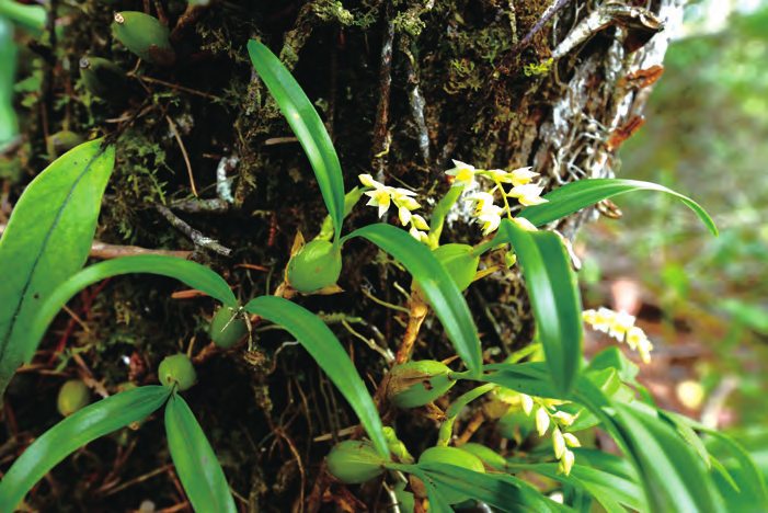 石仙桃屬原生種大多數(shù)在海拔100 ~ 2700m 的亞熱常綠林、雨林、山地雨林和落葉林,棲息地主要包括山坡上、樹陰下或開闊處的闊葉林、濕潤(rùn)林和干燥林,以附生的形式坐長(zhǎng)在苔蘚的巖石、樹干和溪流附近。我國(guó)南方以西南地區(qū)多見,適宜生長(zhǎng)條件為 5℃~ 32℃,適生長(zhǎng)溫度20℃~ 28℃,喜半陰光照,忌悶熱和陽光直射,溫度過高或過低會(huì)使植株生長(zhǎng)受到抑制或死亡。