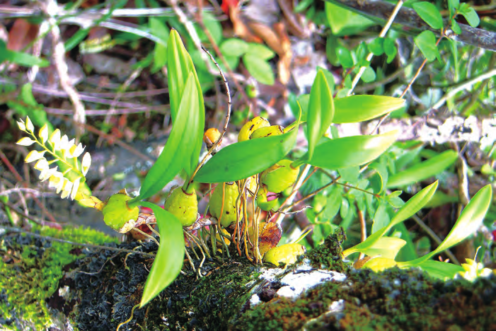 石仙桃為附生或石生,根狀莖粗壯,具匍匐狀,葉革質(zhì),狹橢圓形、卵形或長(zhǎng)圓形,總狀花序具密生穗狀多花,花白色、粉紅色、淺褐色、淡綠色、淡黃色或淺玫瑰色。4 ~ 5 月或7 ~ 10 月。