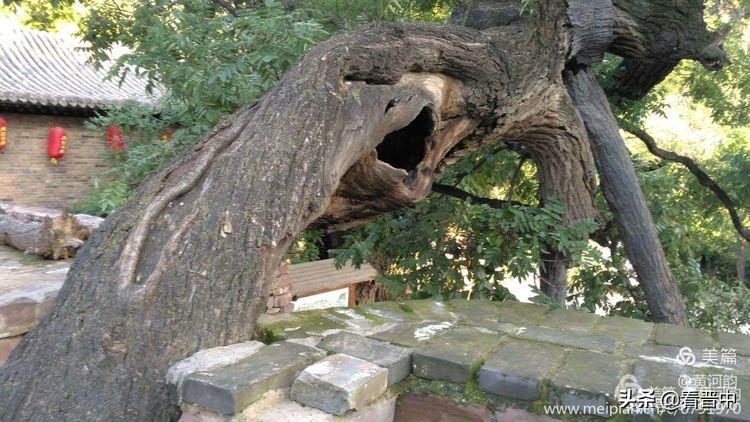 走過龍門石橋便步入村中石徑。石徑彎道口兩株古槐夾道相迎。左側(cè)一株已空心,憑著僅存的樹壁掙扎、扭曲、偃仰著朝路口盤升,在路口的上方又撐開綠意盎然的樹冠。村人怕旺密的樹冠折斷而用棍支撐;右側(cè)一槐更為古老,粗壯的樹干需三人合抱,據(jù)說有一千二百年樹齡。這株老樹也有大段的枯木和大片的郁郁蔥蔥的新枝,下也用棍支撐。兩株老樹像兩位拄著拐杖返老還童的老人。兩樹相對、古道槐蔭、挺立千年,不知迎送了多少南來北往之人。