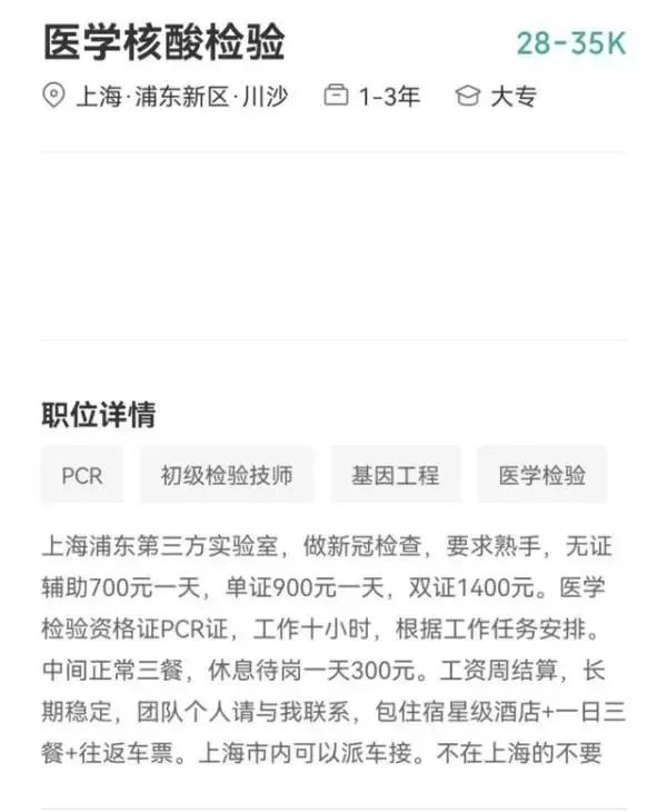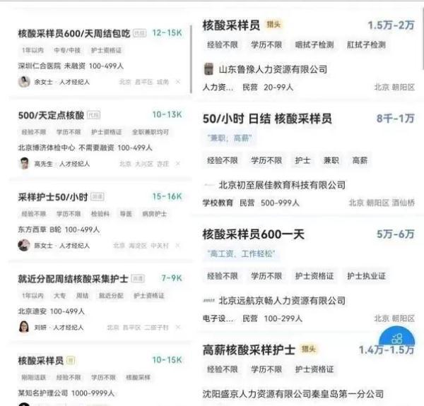 還有部分機(jī)構(gòu)招聘時,也提供短期兼職崗位。公開信息顯示,核酸采樣員如果以日薪結(jié)算,每天400、500和600元三個"尺碼"。