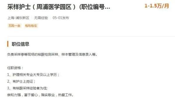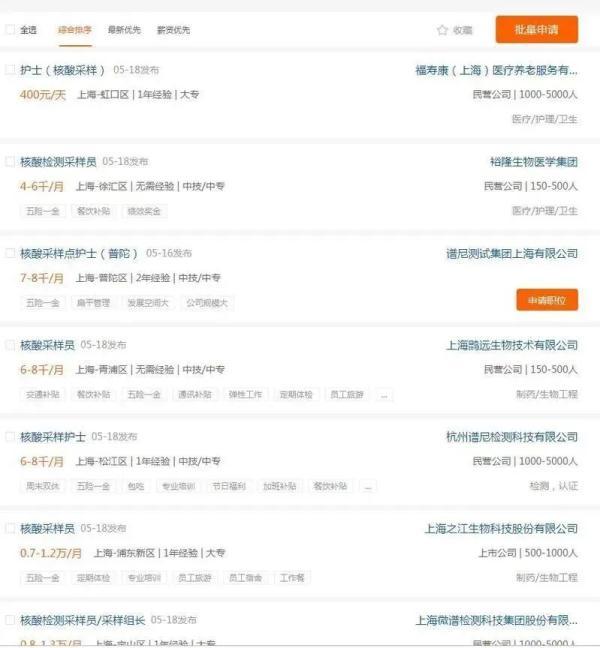 近期隨著檢測量激增,大量招聘核酸采檢人員的主要來自第三方公司。上海也不例外,在招聘網(wǎng)站發(fā)布崗位的用人單位,無一例外都是第三方社會檢測機(jī)構(gòu)。