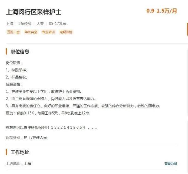 記者仔細(xì)梳理招聘信息,核酸采樣員崗位月薪開價高為1.5萬元,工作地點分別位于閔行、松江和浦東周浦,月薪開價低是4000至6000元,但特別注明這只是底薪,還包括績獎勵,并在漕河涇開發(fā)區(qū)內(nèi)閉環(huán)管理,包吃包住。這些核酸采樣員崗位,要求全職工作。
