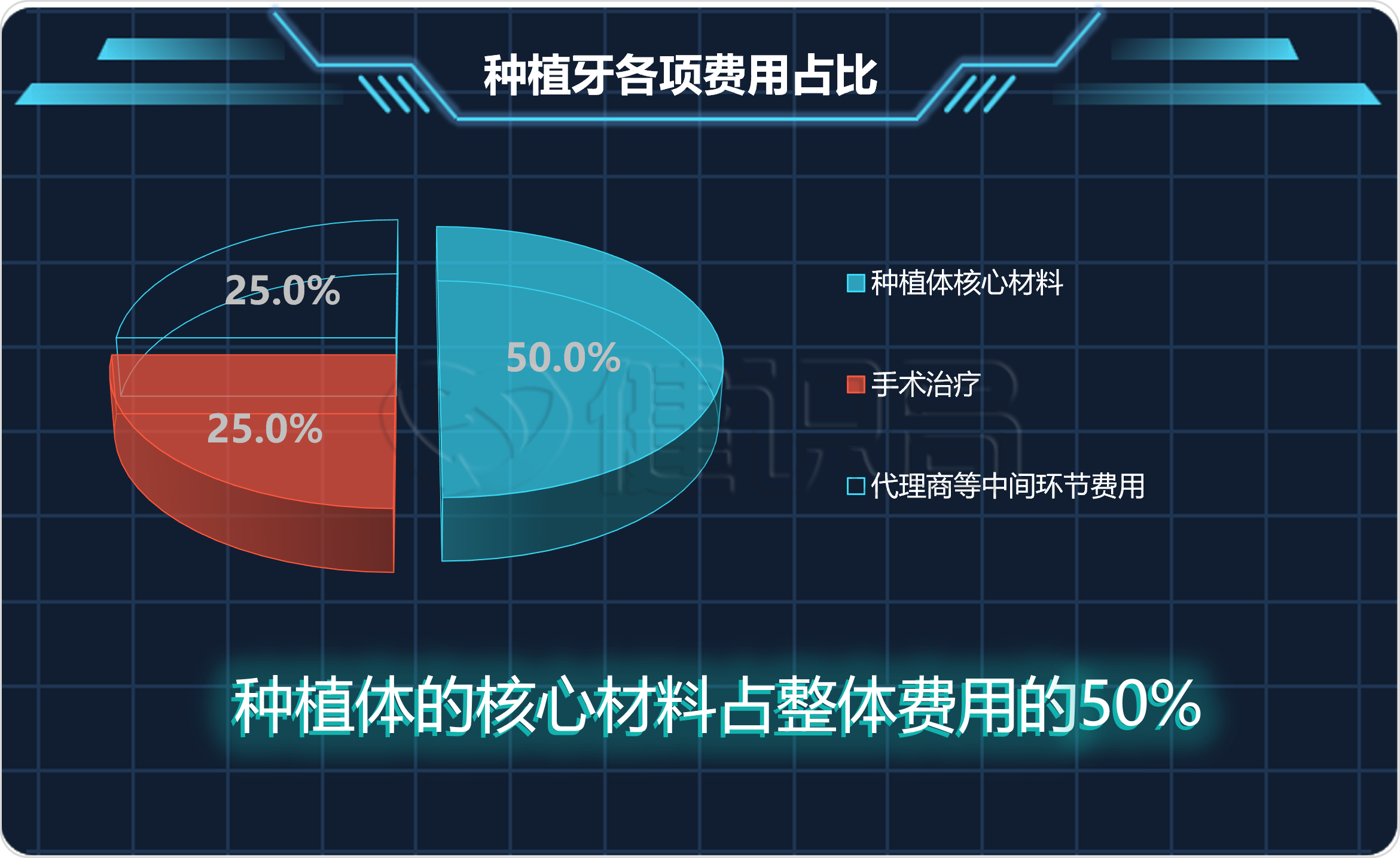 種植牙調(diào)節(jié)費用居高不下,根本原因是在于牙冠種植體等耗材產(chǎn)品上。根據(jù)天平洋證券研究報告顯示,種植牙花費在3500元到1.2萬元之間,種植體的核心材料占整體費用的50%,手術調(diào)節(jié)費用占比25%,剩下的是代理商等中間環(huán)節(jié)費用。
