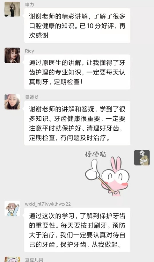 活動(dòng)結(jié)束后大家表示通過(guò)直播學(xué)習(xí)到了很多,以后刷牙也更加知道應(yīng)該怎么刷才是正確的了,對(duì)于牙線的使用也有了更加詳細(xì)的了解,以后牙線也積極用起來(lái)。