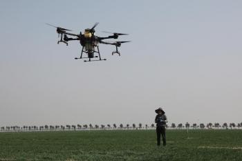 在河北省寧晉縣科優(yōu)糧食種植專業(yè)合作社的麥田邊,無人機正在進行病蟲防控和化學(xué)除草作業(yè)。