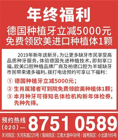 由歐美各大口腔種植品牌廠商聯(lián)合柏德口腔共同發(fā)起的“千人種牙團(tuán)購會”活動在羊城火熱進(jìn)行中。據(jù)悉,團(tuán)購會齊聚數(shù)十位國際口腔醫(yī)學(xué)博士,為羊城缺牙市民帶來德國種植技術(shù)——當(dāng)天種當(dāng)天用,受到缺牙市民的好評。為了惠及更多缺牙市民,2019年新年期間,“千人種牙團(tuán)購會第3期”盛大開啟。屆時中德院長將現(xiàn)身為缺牙市民解答疑惑,歐美各大口腔種植品牌廠商新年送福利。撥打電話020-8751 0589免費領(lǐng)萬元福袋,更有德國種植牙代金券5000元。