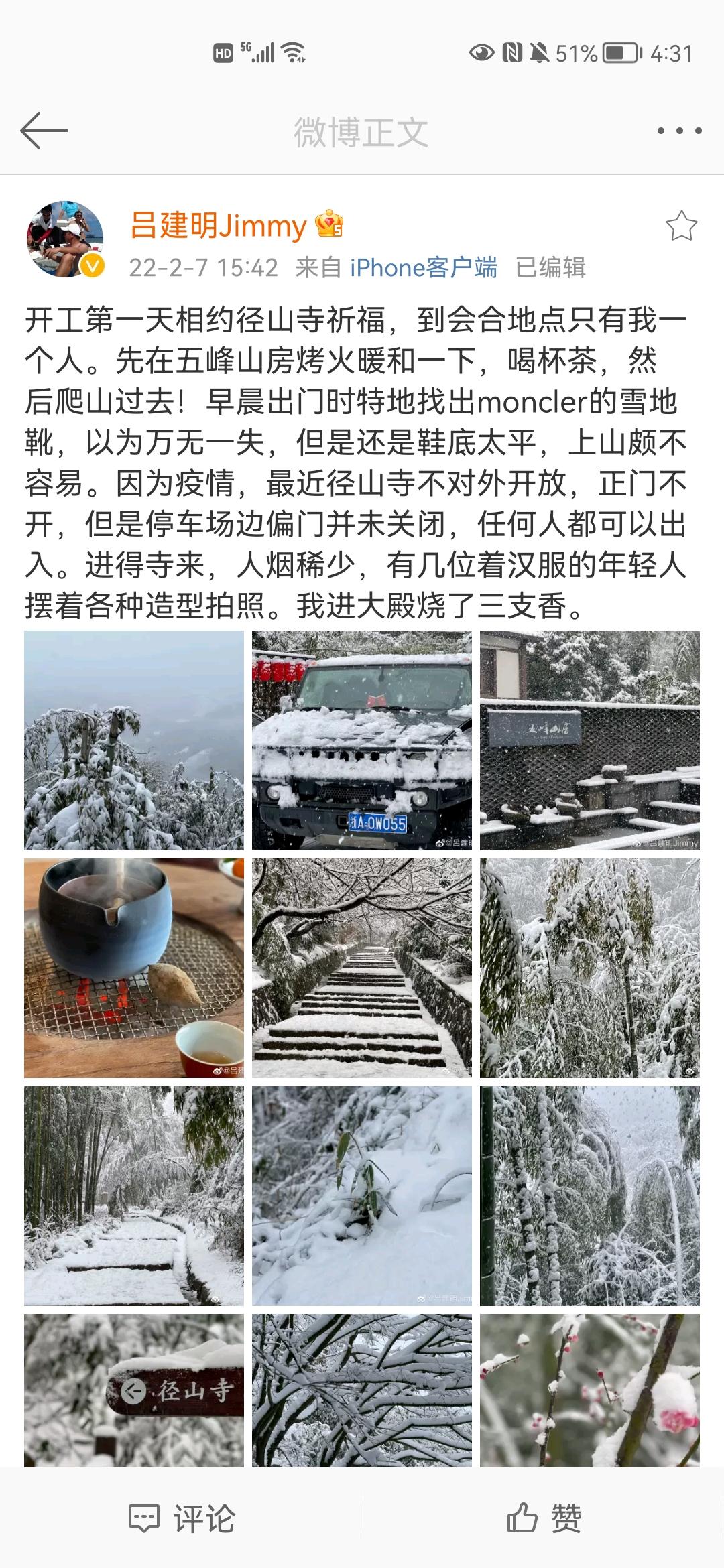 有意思的是,春節(jié)假期結(jié)束后的第一天,通策醫(yī)療董事長呂建明就因違反防疫政策引起眾怒。2月7日,呂建明在微博中表示,“開工第一天相約徑山寺祈?!?yàn)橐咔?,近徑山寺不對外開放……我進(jìn)大殿燒了三支香”。而該微博之前的版本是“……因?yàn)橐咔椋鼜缴剿虏粚ν忾_放,朋友聯(lián)系了寺僧,得以進(jìn)大殿燒了三支香?!本痛?,通策醫(yī)療也被調(diào)侃為“第一只燒香拜佛概念股”。