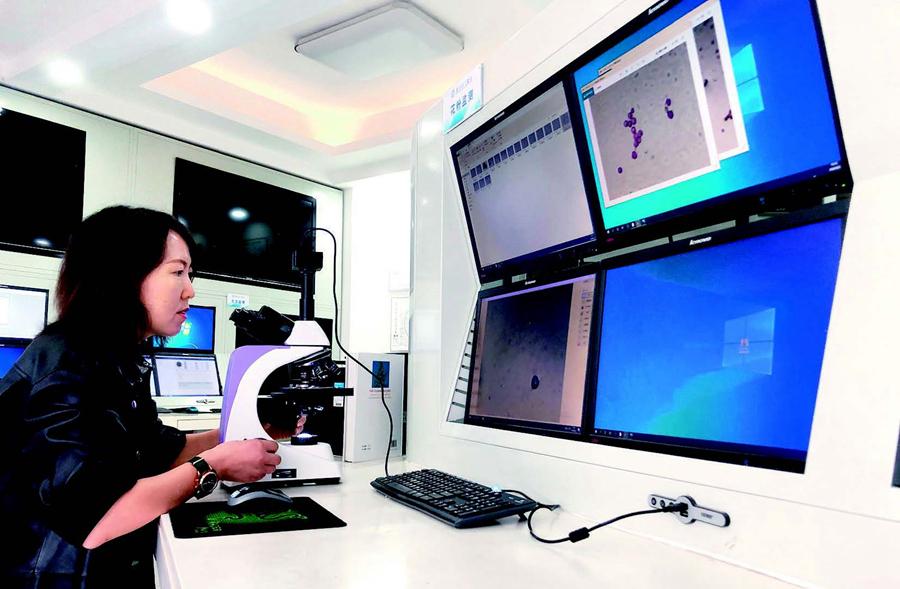 9月2日,呼和浩特市賽罕區(qū)氣象臺(tái)工作人員在利用顯微鏡監(jiān)測(cè)花粉顆粒數(shù) 安路蒙攝