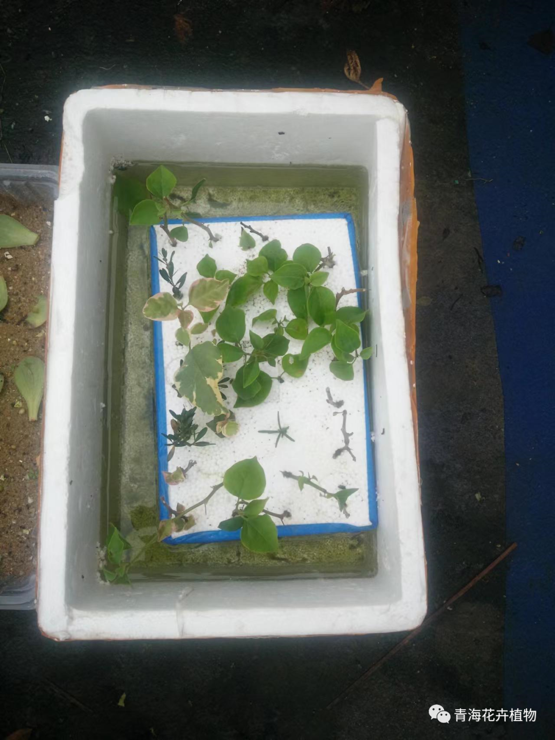 (2).水培扦插法,遵循第一步,剪些要扦插的枝條,讓枝條大部分浮在水面上,比如泡沫板,可以在泡沫板上戳孔,將枝條插在泡沫板上,直接將泡沫板放水面上即可,枝條底部依舊是浸泡水里。