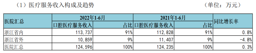 在公司營收構(gòu)成中,醫(yī)療服務(wù)收入仍是主力。報(bào)告期內(nèi),醫(yī)療服務(wù)收入達(dá)12.46億元,占總營收的94.52%。其中,浙江省內(nèi)收入達(dá)11.37億元,占口腔醫(yī)療服務(wù)收入的91%,與上年同期相比增長0.8%;浙江省外收入1.09億元,占口腔醫(yī)療服務(wù)收入的9%,與上年同期相比減少4.8%。