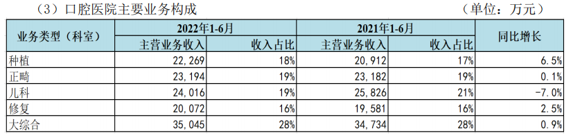 在口腔醫(yī)院主要業(yè)務(wù)構(gòu)成中,大綜合業(yè)務(wù)收入占比高,為28%,同比增長0.9%;修復(fù)業(yè)務(wù)占比低,為16%,同比增長2.5%。此外種植業(yè)務(wù)占比18%,同比增長6.5%;正畸業(yè)務(wù)和兒科業(yè)務(wù)占比均為19%,分別同比增長0.1%、同比下降7%。