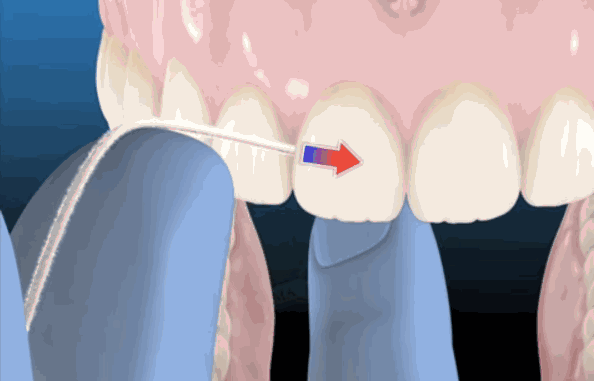2. 牙線緊貼牙齒鄰面,拉動進(jìn)入牙縫。