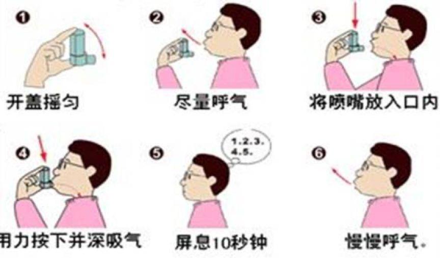 使用氣霧劑之前盡量將痰液咳出,口腔內(nèi)的食物咽下。使用時(shí),先將氣霧劑上下?lián)u動(dòng)數(shù)次,患者含住開口,頭略后仰并緩慢地呼氣,盡可能呼出肺內(nèi)空氣,將吸入器吸口含在口中,并屏住呼吸,以食指和拇指緊按吸入器,使藥物釋出,并同時(shí)做與噴藥同步的緩慢深吸氣,屏氣5-10秒鐘后,緩緩將氣體從鼻腔呼出。間隔30秒,再次噴霧。然后用半杯清水漱口,去除上咽部殘留的藥物。