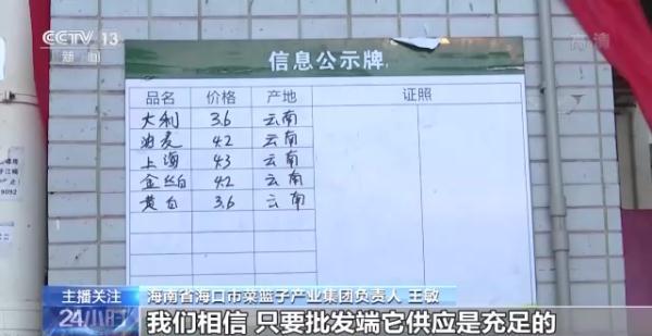 海南省海口市菜籃子產(chǎn)業(yè)集團負責人 王敏:這次,我們把云南菜調過來,在批發(fā)環(huán)節(jié)發(fā)力,我們相信,只要批發(fā)端它供應是充足的,那么菜價也會穩(wěn)定。