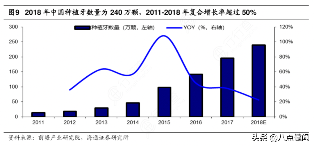 據(jù)研究機(jī)構(gòu)統(tǒng)計(jì),2018年中國種植牙數(shù)量為240萬顆(約為2017年潛在缺牙數(shù)量的千分之一),2011~2018年,復(fù)合增長率超過50%。這正是一個(gè)供不應(yīng)求,高速成長的市場。