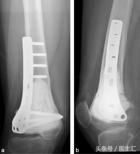 由于行軟骨下骨處植骨,故囑患者術(shù)后3個(gè)月,攝片示植骨愈合后,患肢開始負(fù)重(圖29‐4a,圖29‐4b)。此患者已術(shù)后隨訪兩年,局部無復(fù)發(fā),胸部無轉(zhuǎn)移,植骨已愈合,功能良好。