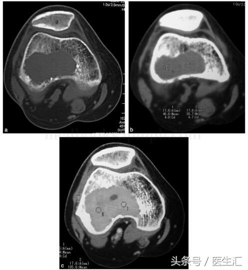 影像學(xué)檢查:X 線示右股骨遠(yuǎn)端骨端發(fā)生的一個(gè)偏心、基質(zhì)均勻、皮質(zhì)膨脹、皮質(zhì)無骨破壞、無骨膜反應(yīng)、無軟組織腫塊的溶骨性破壞(圖29‐1a,圖29‐1b)。CT 示右股骨遠(yuǎn)端骨端的溶骨性破壞,基質(zhì)均勻,注射造影劑后,病變強(qiáng)化,CT 值由強(qiáng)化前的40HU 增加到強(qiáng)化后的110HU(圖29‐2a~圖29‐2c)。
