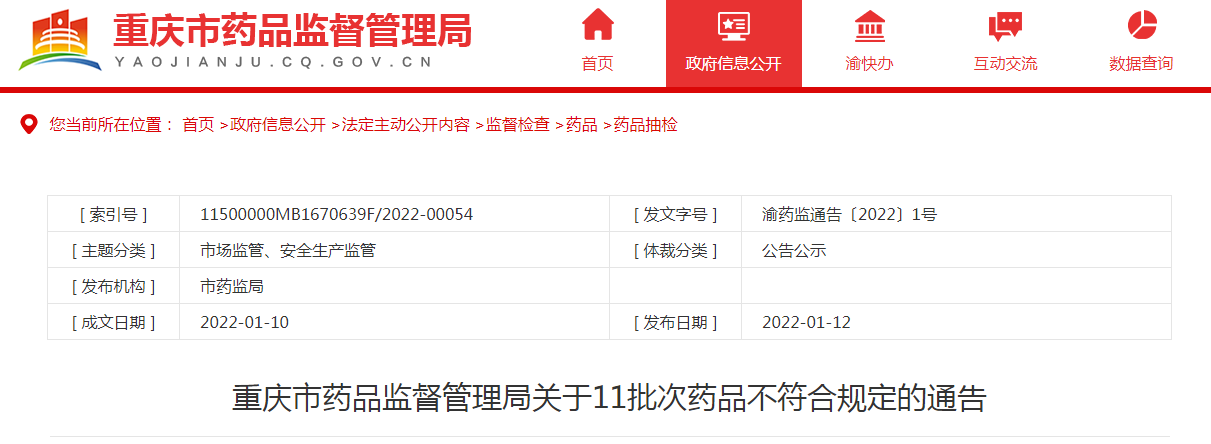 中國質量新聞網訊 2022年1月12日,重慶市藥品監(jiān)督管理局網站發(fā)布關于11批次藥品不符合規(guī)定的通告。通告稱,為了加強藥品質量監(jiān)督管理,規(guī)范市場秩序,保障公眾用藥,該局組織局屬檢查局、各區(qū)縣藥品監(jiān)管部門和檢驗機構開展藥品抽檢。經重慶市食品藥品檢驗檢測研究院等檢驗機構檢驗,標示為廣西慧寶源醫(yī)藥科技有限公司等9家企業(yè)(醫(yī)院)生產(配制)的11批次藥品不符合規(guī)定。