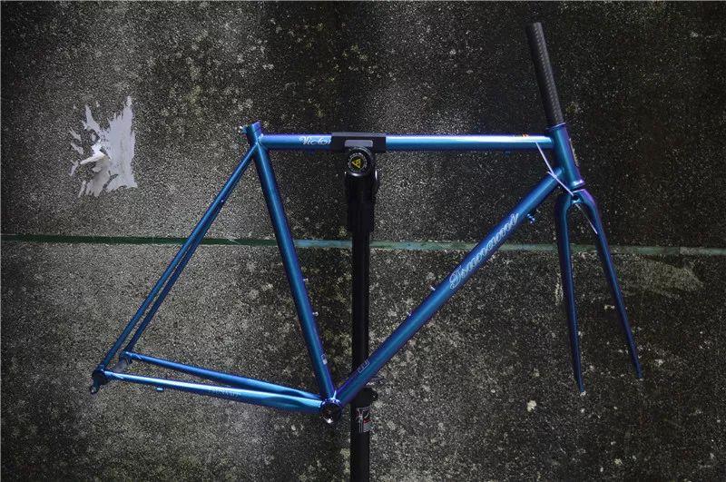 架子目前有4個尺寸,使用隱藏碗組,更纖細(xì)的后上叉,前三角下管加粗。讓整個鋼架在不降低剛性和強(qiáng)度的情況下重量大幅度減輕。全碳前叉,隱藏式軸承碗組,使用漂亮的藍(lán)紫色 變色龍烤漆,通過不同的角度觀看,車架可以呈現(xiàn)深淺不一的藍(lán)紫色變色龍的果。