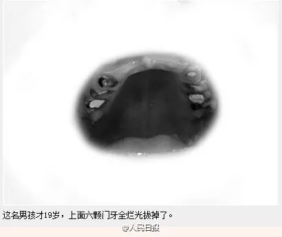 2015年9月,浙江寧波一19歲高中生因牙病就醫(yī)發(fā)現(xiàn),28顆牙全部爛光!拔掉8顆、折斷10顆,其余也沒一顆完整。該男孩從12歲開始把飲料當(dāng)水喝,嚼口香糖代替刷牙。醫(yī)生表示,從業(yè)二三十年,從來沒見過一個高中生的牙齒會爛成這樣。