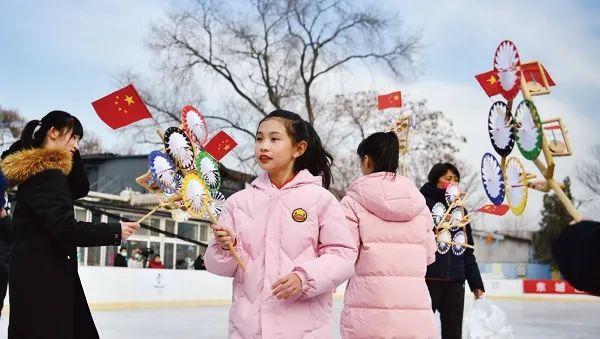 2022年1月19日,孩子們手拿奧運(yùn)五環(huán)風(fēng)車,在北京天壇體育活動中心滑冰場內(nèi)玩耍。