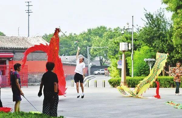 2022年8月4日,北京鐘鼓樓廣場上,市民在玩“手舞龍”。