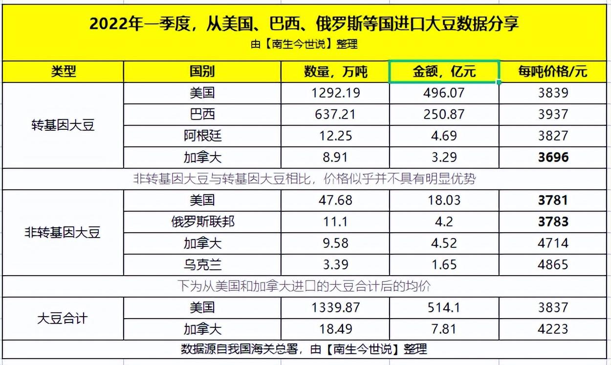 南生將海關(guān)總署公開的信息匯總后發(fā)現(xiàn):今年一季度我國從美國、巴西、阿根廷、俄羅斯、加拿大、烏克蘭等國進口的大豆價格(到岸價)差異較大。其中,加拿大非轉(zhuǎn)基因大豆的價格,遠(yuǎn)遠(yuǎn)超過了轉(zhuǎn)基因大豆。