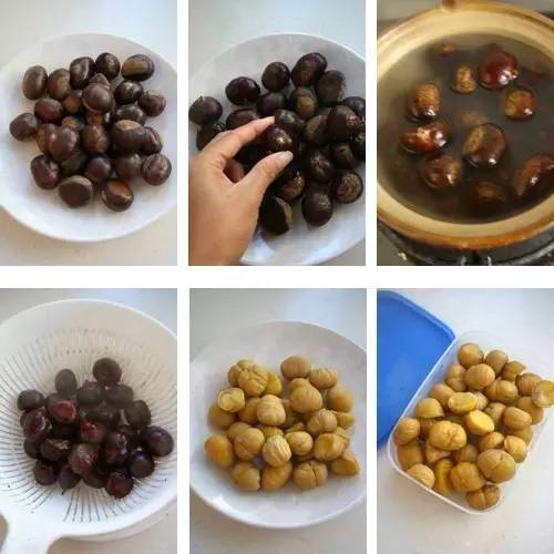 【電飯鍋法】:板栗清洗后,切個口子,放在電飯鍋中,不用放水;按下煮飯鍵,取出來剝殼和皮;但是這個煮好后,就是熟的了。所以很容易剝碎。顏色也不太好看。