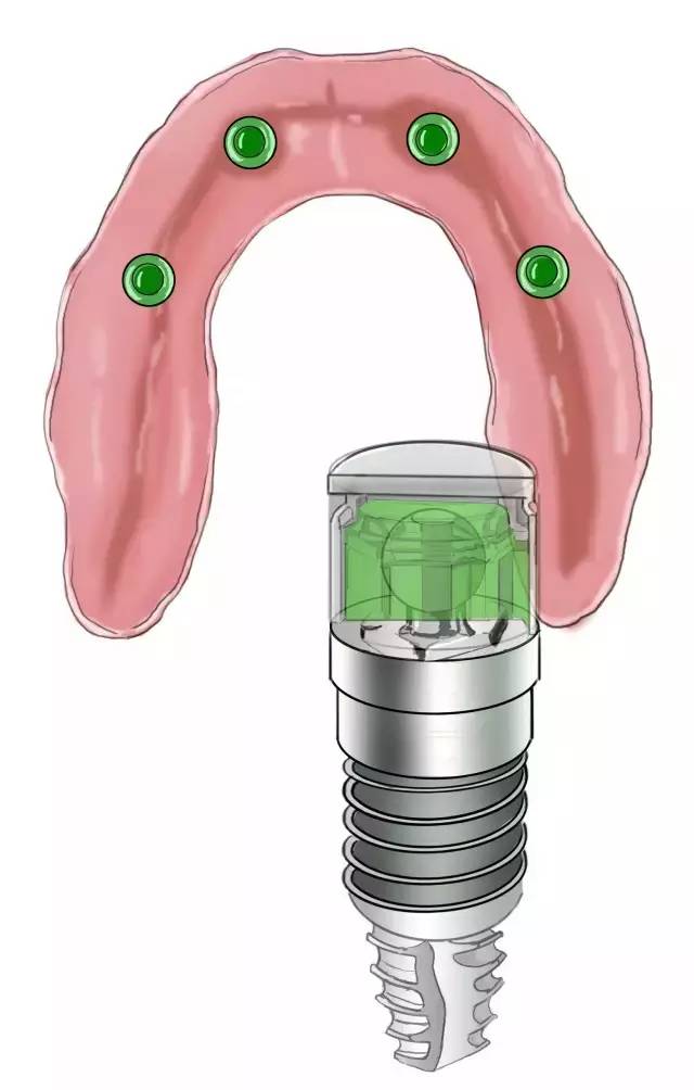 修復(fù)基臺連接上 球帽固位裝置——準(zhǔn)確的說是“球”,“帽”在總義齒的組織面上。